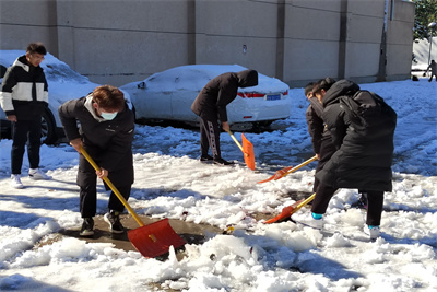 办公楼以及周边主干道路上的积雪和冰一点点地清扫干净。扫雪过程中,党支部成员及学院学生组织成员不畏严寒,积极主动、相互配合、齐心协力,挥舞着铁锹和笤帚,处处留下热火朝天的劳动场面。仅仅一个多小时的时间,原本积雪覆盖的道路,就变成了一条宽阔畅通的“安全通道”,为师生平安出行提供了便利。在略露寒意的傍晚,干净整洁的路面让每位过路的师生感到慰藉。