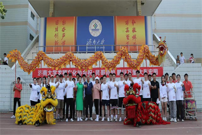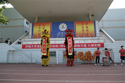 随着学院老师和毕业生到场,活动开始伴随着铿锵有力的锣鼓音乐,两条舞龙也立刻欢腾跳跃起来。社团队员手持巨龙轮番上阵,或腾跃、或滚动、或盘起、或穿插、转腾挪间,时而在追逐宝珠的过程中头尾齐钻,时而入海破浪飞腾跳跃,变成了活跃灵动的金龙。抖擞的精神状态,精彩纷呈的龙舞,向老师和学生们展示了体院特有的传统表演。辗随着鼓点快、慢、轻、重的节奏时两只分别由两人组成的狮子,时而跳起,时而站立,时而走向观众面前,还不停地点头“打招呼。一段精彩的龙舞,时而游龙戏珠、时而蟠龙飞天,气势磅礴、雄浑豪壮。随着舞狮和舞龙相互缠绕、嬉戏把整个活动推向了高潮,老师和毕业生纷纷被精彩的表演所震撼。随着两条舞狮嘴里吐出欢送毕业生条幅,此次活动到此结束。