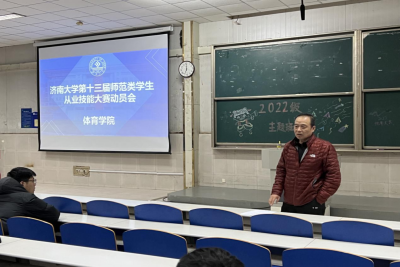 济南大学体育学院于2月27日晚在辰星园召开第十三届师范类学生从业技能大赛动员会,体育学院院长助理艾军、体育学院2022级全体学生参加,2022级辅导员朱志乐主持本次动员会。