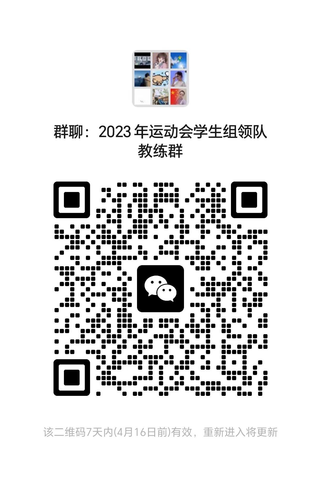 3. 请各单位的领队、教练员、负责本单位运动会报名的工作人员分别加入“2023年运动会学生组领队教练群”和“2023年运动会教工组领队群”,进群二维码见下方。为保证运动会组织工作的顺利进行,其他人员请不要扫码进群。